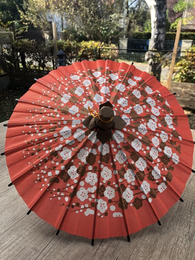 Dekorációs célokra, japán rizspapírból készített mini esernyő. Az ernyő átmérője 30 cm. Műanyag küllőkkel. Mindegyikhez van egy kis műanyag talp, ami felerősíthető (pl. falra), ebben támaszkodik az ernyőt.